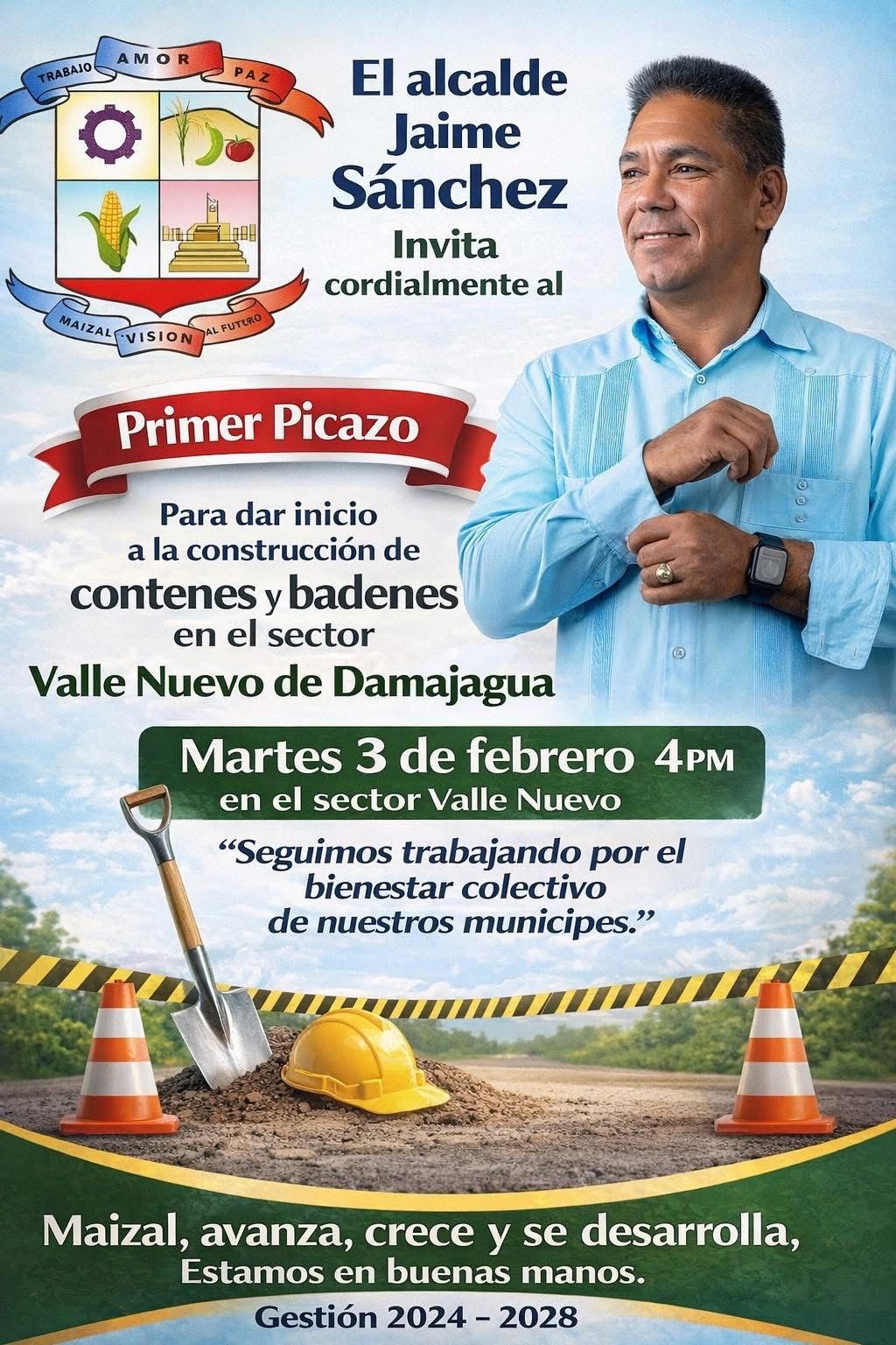 El Lic. Jaime Sánchez director del El Lic. Jaime Sánchez director del ayuntamiento de maizal invita al acto del primer picazo de la construcción de contenes y badenes en el sector valle nuevo Damajagua, del distrito de maizal este martes 3 de febrero 2026 a partir de las 4 de la tarde., del distrito de maizal este martes 3 de febrero 2026 a partir de las 4 de la tarde.