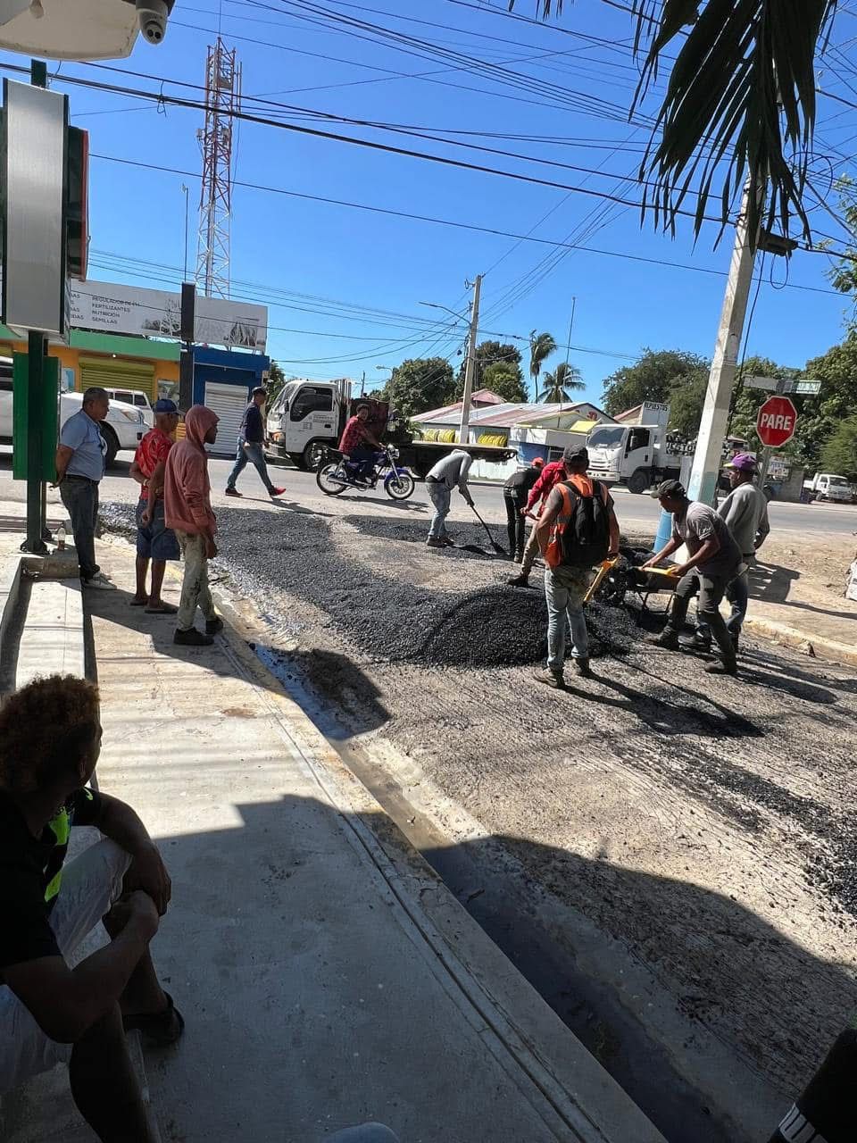 En el día de hoy fuimos a solucionar la problemática de la entrada antigua peña la cual después del asfaltado de la autopista Duarte quedó a un gran desnivel la cual para los vehículos, motores y pasolas le incomodaba entrar por esa calle, a esta le hicimos el asfáltado nuevo corrigiendo este mal y además hicimos el bacheo de la calle donde quiera que tenia hoyos y grietas.